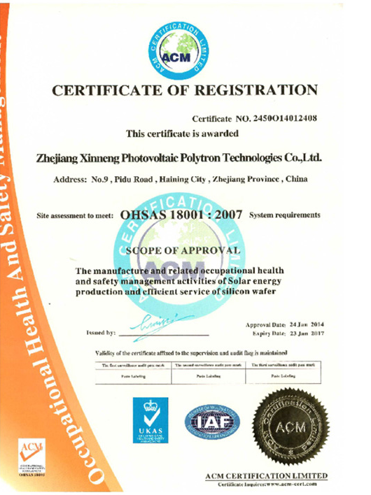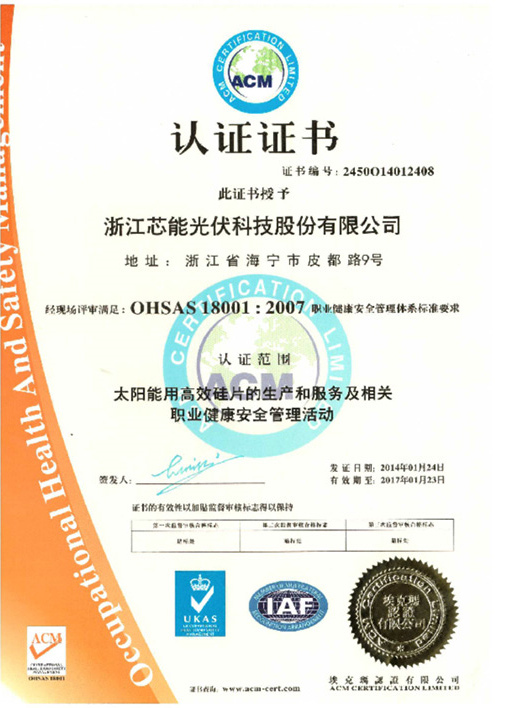 公司通过OHSAS18001:2007职业健康宁静治理体系认证