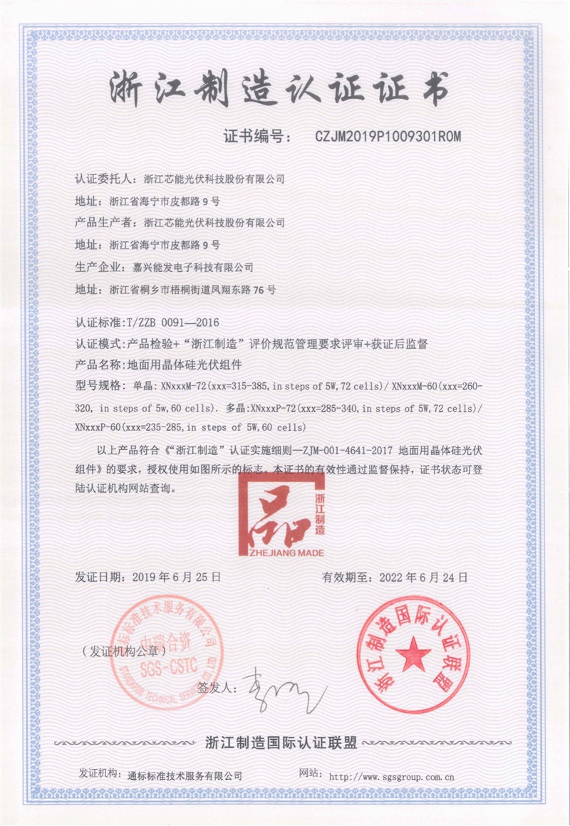 为进一步提升我司组件品牌竞争力,公司于2018年开始计划加盟“浙江制造”,在公司领导的支持下,经过我司各职能部分近一年的辛勤劳动和密切配合,公司于2019年6月5日,顺利通过“浙江制造”现场审核,于2019年6月25日获得“浙江制造”认证证书。